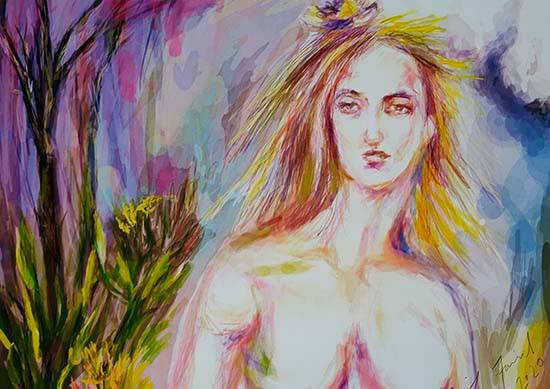 This painting by artist Fariel Shafee (46 years) received a Honorable Mention in Khula Aasmaan online painting contest for January to March 2021.