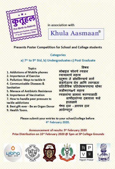 Khula Aasmaan and Kutuhal organised a poster competition for school children and college students. Select entries from this poster contest were displayed at the exhibition venue. This exhibition focused on medical technologies and health care systems. The exhibition was held at S. P. College ground at Pune from February 7 to 10, 2020.