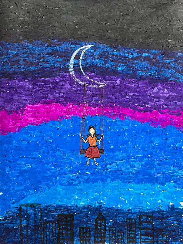 Swinging on the moon, painting by Child Artist Mihika Jagtap