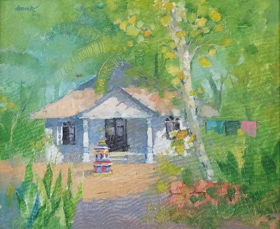 Information This acrylic on canvas painting by Anwar Husain captures the tranquility and greenery, both central to life at Goa. The presence of a Tulshi Vrindavan is a nice and colourful part of this charming visual.