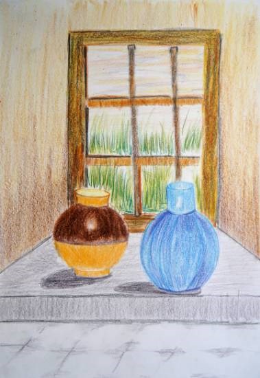 Two Pots, painting by Child Artist Rishab Girish Shortlist from Khula Aasmaan art contest for children Keywords: two pots , window , yellow pot , sky blue pot , pot shadow View Portfolio icon Share Facebook Twitter Whats App Pinterest Description -- Art Number 21526 Artwork Title Two Pots Artist Name Rishab Girish Medium Colour Pencil on Paper Size 11.75 x 8.5 inches (29.845 x 21.59 cm) Information This painting by child artist Rishab Girish was shortlisted in Khula Aasmaanfree kids painting contest in india for October to December 2018.