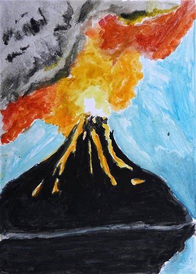 Volcanic Eruption Painting by Sreebhadra Suraj (class 3) shortlisted in National Painting Competition by Khula Aasmaan & IISER Pune (2019) Keywords: Volcanic Eruption , volcano , rupture , hot lava , volcanic ash , magma , flames , temperature , high temperature , reflection View Portfolio icon Share Facebook Twitter Whats App Pinterest Description -- Art Number 22918 Artwork Title Volcanic Eruption Artist Name Sreebhadra Suraj Medium Watercolour on Paper Size 11.69 x 8.27 inches (29.6926 x 21.0058 cm) Information Artwork volcanic eruption did in watercolor. Can be seen the flames in high temperature & highly black ash containing fumes are flowing away due to wind. The lava is flowing. The reflection of Dark volcano and blue sky is reflected in the water body below.
