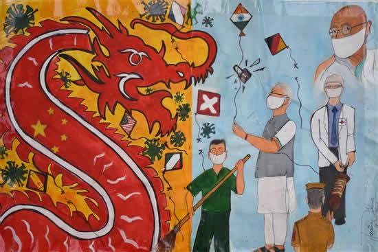 India Fights Covid - 19 Silver medal in Khula Aasmaan painting competition for students Keywords: india , Covid - 19 , kites , pm narendra modi , police , healthcare sector View Portfolio icon Share Facebook Twitter Whats App Pinterest Description -- Art Number 23521 Artwork Title India Fights Covid - 19 Artist Name Jessica Wadhwa Medium Acrylic on Paper Size 11.69 x 16.53 inches (29.6926 x 41.9862 cm) Information The global symbol of China is the dragon and the imprint of the Chinese flag on the very same dragon justifies the fact that the red dragon signifies the presence of China. PM Narendra Modi is the man who is chosen to be the decision-maker of our nation but without the help of police and healthcare sector, he alone cannot stand strong therefore the kite being flown by PM Modi signifies his authority and the thread sheave is in the hands of policeman and a doctor which thereafter explains the indefinite support provided by them, in this pandemic. The hygiene levels are being maintained by the domestic workers incessantly and the most important component, which according to me are the kites signifying few of the most adversely affected countries around the globe whose threads are shown to be cut and still the kite of our nation flies mapping the heights of the sky with a lock on the thread which is the symbolic representation of the lockdown in our nation. Even after being the second most populated country in the world we have not been so adversely affected as the other ‘developed’ and ‘least’ populated countries have. Overall, this composition describes how India stands strong when united and on it. This painting by young artist Jessica Wadhwa (17 years) received a Silver medal in Khula Aasmaan painting competition for students for April to June 2020. See the video about this artwork Listen to the audio about this artwork