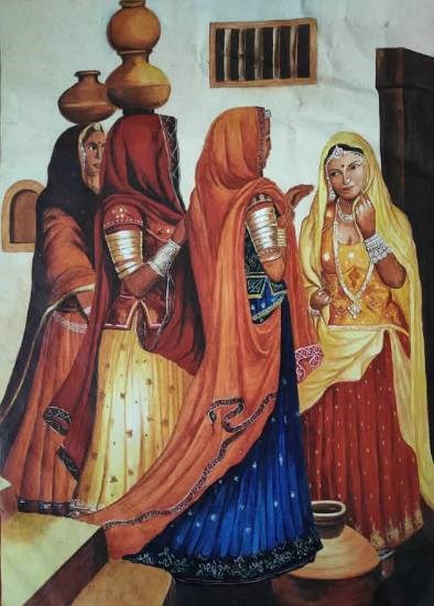 Lifestyle of Rajasthan Honorable Mention in Khula Aasmaan national art competition for young adults Keywords: rajasthani artwork. lifestyle , villages , four village women , four village women gossiping and whispering , way of fetching water View Portfolio icon Share Facebook Twitter Whats App Pinterest Description -- Art Number 23632 Artwork Title Lifestyle of Rajasthan Artist Name Rima Pramanik Medium Watercolour & pencil on Paper Size 16.53 x 11.69 inches (41.9862 x 29.6926 cm) Information It is a Rajasthani art work. The image says a part of lifestyle of Rajasthan villages. Here we see four village women are gossiping and whispering on their way of fetching water. This painting by young artist Rima Pramanik (21 years) received a Honorable Mention in Khula Aasmaan national art competition for young adults for July to September 2020. See the video about this artwork