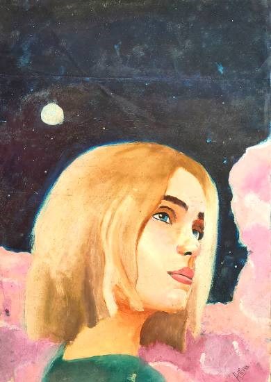 Dreamy nights Honorable Mention in Khula Aasmaan children's painting competition Keywords: a beautiful girl , a starry night , dreamy eyes , first oil painting , an inspired work , eyes full of dreams , portrait painting View Portfolio icon Share Facebook Twitter Whats App Pinterest Description -- Art Number 23888 Artwork Title Dreamy nights Artist Name Alina Ghatte Medium Oil colour on Oil paper Size 16.53 x 11.69 inches (41.9862 x 29.6926 cm) Information A beautiful girl with dreamy eyes in a starry night. Her eyes are full of dreams just like mine. This artwork was my first oil painting which was an inspired work. This painting by child artist Alina Ghatte (14 years) received a Honorable Mention in Khula Aasmaan children's painting competition for April to June 2021.