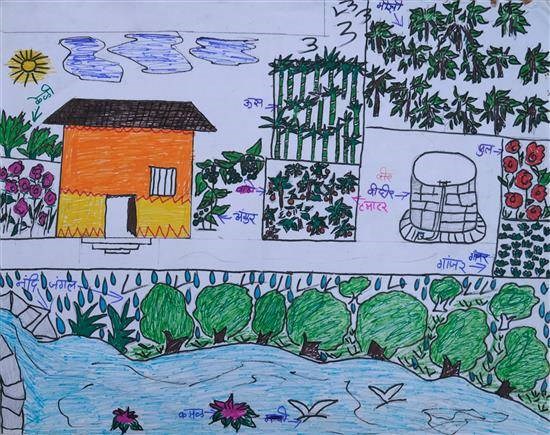 My Home Shortlisted from Art contest no. 1 for all Ashramshalas Keywords: my home , trees of banana , tomato , chili pepper , vine of grapes , sugar cane , sun , well , lotus View Portfolio icon Share Facebook Twitter Whats App Pinterest Description -- Art Number 25191 Artwork Title My Home Artist Name Rubina Kumare Medium Sketch Pen on Paper Size 13.77 x 16.73 inches (34.9758 x 42.4942 cm) Information Rubina Kumare (class 9), Kolitmara Ashramshala, Nagpur PO - Shortlisted from Art contest no. 1 for all Ashramshalas of Tribal Development Department, Govt. of Maharashtra