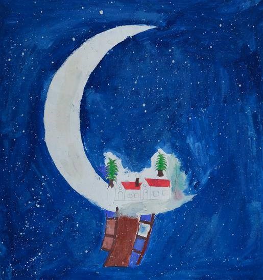 Our houses on the Moon Shortlisted from Art contest no. 1 for all Ashramshalas Keywords: sky in night , big Moon , stars , ladder , moon , chandrakor , half moon , houses on moon , night , starry night View Portfolio icon Share Facebook Twitter Whats App Pinterest Description -- Art Number 25629 Artwork Title Our houses on the Moon Artist Name Sachin Chaungad Medium Water colour and pencil on Paper Size 13.77 x 10.62 inches (34.9758 x 26.9748 cm) Information Sachin Chaungad (class 9), Tembli Ashramshala, Dharani PO - Shortlisted from Art contest no. 1 for all Ashramshalas of Tribal Development Department, Govt. of Maharashtra