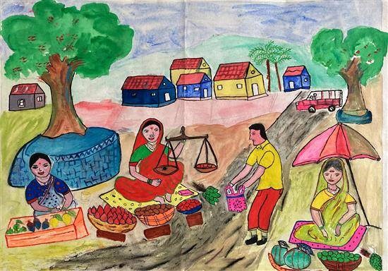 Vegetable Market Shortlisted from Art contest no. 2 for all Ashramshalas Keywords: vegetable market , fruit seller , customer , houses , bus , scales , coconut tree , umbrella View Portfolio icon Share Facebook Twitter Whats App Pinterest Description -- Art Number 25877 Artwork Title Vegetable Market Artist Name Shreya Pote Medium Poster colour on Paper Size 11.61 x 16.53 inches (29.4894 x 41.9862 cm) Information Shreya Pote (class 9), Sonawale Ashramshala, Ghodegaon PO - Shortlisted from Art contest no. 2 for all Ashramshalas of Tribal Development Department, Govt. of Maharashtra
