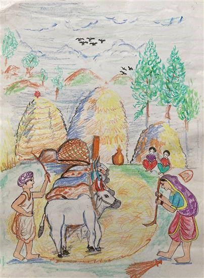 Crop's threshing Shortlisted from Art contest no. 2 for all Ashramshalas Keywords: crop's threshing , farming process , bulls threshing crops , threshing's traditional way , farmers , woman helping farmer , plenty of grass , children watching threshing , pot , tree wood View Portfolio icon Share Facebook Twitter Whats App Pinterest Description -- Art Number 26308 Artwork Title Crop's threshing Artist Name Dhananjay Lahare Medium Crayons on Paper Size 14.56 x 10.62 inches (36.9824 x 26.9748 cm) Information Dhananjay Lahare (class 10), Kohor Ashramshala, Nashik PO - Shortlisted from Art contest no. 2 for all Ashramshalas of Tribal Development Department, Govt. of Maharashtra
