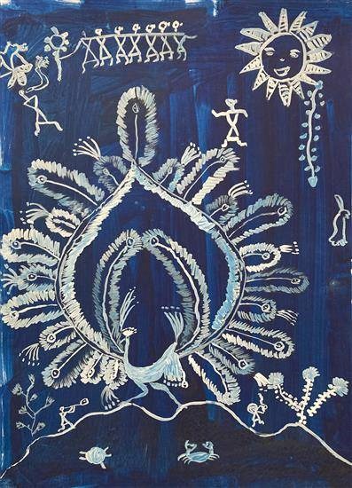 Warli painting - 17 Shortlisted from Art contest no. 2 for all Ashramshalas Keywords: warli painting , warli , wind instrument player , drum player , tribal dancers , Sun , Rabbit , dancing peacock , fluffy opened feather , crabs in water View Portfolio icon Share Facebook Twitter Whats App Pinterest Description -- Art Number 26319 Artwork Title Warli painting - 17 Artist Name Payal Darode Medium Poster colour on Paper Size 14.56 x 10.62 inches (36.9824 x 26.9748 cm) Information Payal Darode (class 7), Bhuvan Ashramshala, Nashik PO - Shortlisted from Art contest no. 2 for all Ashramshalas of Tribal Development Department, Govt. of Maharashtra