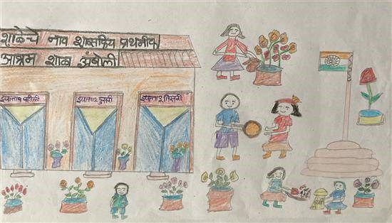 Amboli Ashramshala Shortlisted from Art contest no. 2 for all Ashramshalas Keywords: my school , Amboli Ashramshala , class rooms , standards , students , planting pot , colorful flowers , girl cleaning premises , dust bin , flag View Portfolio icon Share Facebook Twitter Whats App Pinterest Description -- Art Number 26356 Artwork Title Amboli Ashramshala Artist Name Rohini Pawar Medium Oil Pastel on Paper Size 8.28 x 13.77 inches (21.0312 x 34.9758 cm) Information Rohini Pawar (class 7), Amboli Ashramshala, Nashik PO - Shortlisted from Art contest no. 2 for all Ashramshalas of Tribal Development Department, Govt. of Maharashtra