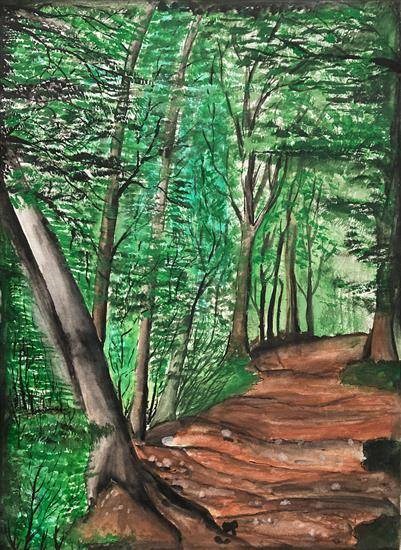 Into the forest Shortlisted from Art contest no. 2 for all Ashramshalas Keywords: Into the forest , forest , greenery , woods , trees , path , way , dense tree , tree branches , leaves View Portfolio icon Share Facebook Twitter Whats App Pinterest Description -- Art Number 26449 Artwork Title Into the forest Artist Name Vivek Dhadaga Medium Watercolour on Paper Size 11.43 x 8.26 inches (29.0322 x 20.9804 cm) Information Vivek Dhadaga (class 9), Kalamdevi Ashramshala, Dahanu PO - Shortlisted from Art contest no. 2 for all Ashramshalas of Tribal Development Department, Govt. of Maharashtra