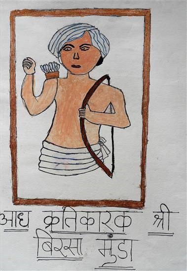 Aadya krantikarak Birsa Munda Shortlisted from Art contest no. 3 for all Ashramshalas Keywords: Aadya krantikarak , Birsa Munda , tribal freedom fighter , holded bow , bunch of arrow , turban , tribal costume View Portfolio icon Share Facebook Twitter Whats App Pinterest Description -- Art Number 26690 Artwork Title Aadya krantikarak Birsa Munda Artist Name Akansha Gajabhe Medium Mixed Media on Paper Size 14.98 x 11.02 inches (38.0492 x 27.9908 cm) Information Akansha Gajabhe (class 7), Jambhulghat Ashramshala, Chimur PO - Shortlisted from Art contest no. 3 for all Ashramshalas of Tribal Development Department, Govt. of Maharashtra