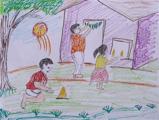 Diwali celebration Shortlisted from Art contest no. 3 for all Ashramshalas Keywords: Diwali celebration , girl preparing lamp , boy hanging archway , lantern , roof tile home , boy playing crackers , grass , pink flowers , greenery View Portfolio icon Share Facebook Twitter Whats App Pinterest Description -- Art Number 26943 Artwork Title Diwali celebration Artist Name Rutuja Shelake Medium Oil Pastel on Paper Size 13.97 x 14.17 inches (35.4838 x 35.9918 cm) Information Rutuja Shelake (class 8), Surudi Ashramshala, Aurangabad PO - Shortlisted from Art contest no. 3 for all Ashramshalas of Tribal Development Department, Govt. of Maharashtra