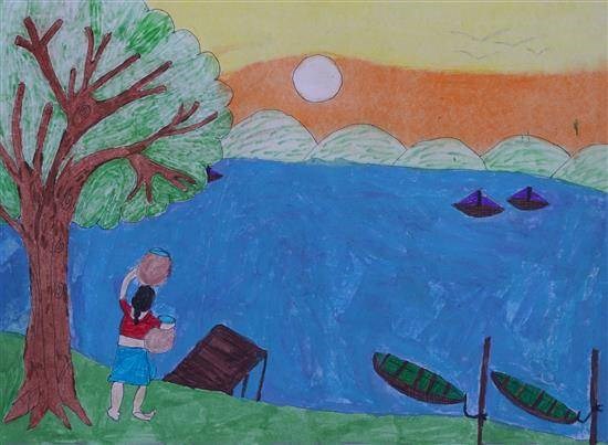 Morning sky Shortlisted from Art contest no. 3 for all Ashramshalas Keywords: morning sky , yellow orange sky , mountain , river bank , boats , girl arrived to river , to carry water View Portfolio icon Share Facebook Twitter Whats App Pinterest Description -- Art Number 26961 Artwork Title Morning sky Artist Name Vrushabh Belsare Medium Oil Pastel on Paper Size 11.02 x 13.97 inches (27.9908 x 35.4838 cm) Information Vrushabh Belsare (class 9), Amaravti Ashramshala, Dharani PO - Shortlisted from Art contest no. 3 for all Ashramshalas of Tribal Development Department, Govt. of Maharashtra