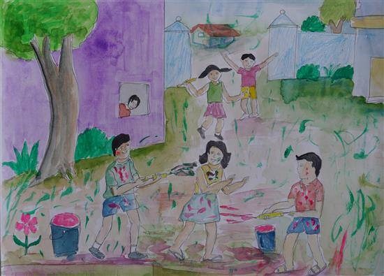 Enjoyment of color festival Shortlisted from Art contest no. 3 for all Ashramshalas Keywords: enjoyment , color festival , color gun , roof tile homes , bush , grass , bucketful color water , pink flower , happy children , color splash View Portfolio icon Share Facebook Twitter Whats App Pinterest Description -- Art Number 27009 Artwork Title Enjoyment of color festival Artist Name Vinod Coreti Medium Watercolour & pencil on Paper Size 11.02 x 14.96 inches (27.9908 x 37.9984 cm) Information Vinod Koreti (class 8), Sawargaon Ashramshala, Gadchiroli PO - Shortlisted from Art contest no. 3 for all Ashramshalas of Tribal Development Department, Govt. of Maharashtra