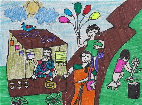 Shop of colors Shortlisted from Art contest no. 3 for all Ashramshalas Keywords: shop of colors , seller , woman purchasing colors , boy holded balloons , little boy , planting tree , Sun , cloud , blue bird View Portfolio icon Share Facebook Twitter Whats App Pinterest Description -- Art Number 27012 Artwork Title Shop of colors Artist Name Saniya Narote Medium Oil Pastel and Sketch pen on Paper Size 7.08 x 9.44 inches (17.9832 x 23.9776 cm) Information Saniya Narote (class 8), Potegaon Ashramshala, Gadchiroli PO - Shortlisted from Art contest no. 3 for all Ashramshalas of Tribal Development Department, Govt. of Maharashtra