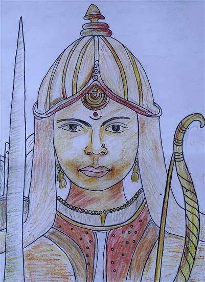 A brave queen Bronze medal from Art contest no. 3 for all Ashramshalas Keywords: a brave queen , queen Durgavati , empress of Gondwana , wearing helmet , holded bow , sword , corselet , crescent moon , ornaments View Portfolio icon Share Facebook Twitter Whats App Pinterest Description -- Art Number 27091 Artwork Title A brave queen Artist Name Madhuri Pendam Medium Oil Pastel and Sketch pen on Paper Size 14.96 x 10.62 inches (37.9984 x 26.9748 cm) Information Madhuri Pendam (class 9), Chindhichak Ashramshala, Chimur PO - Bronze medal from Art contest no. 3 for all Ashramshalas of Tribal Development Department, Govt. of Maharashtra