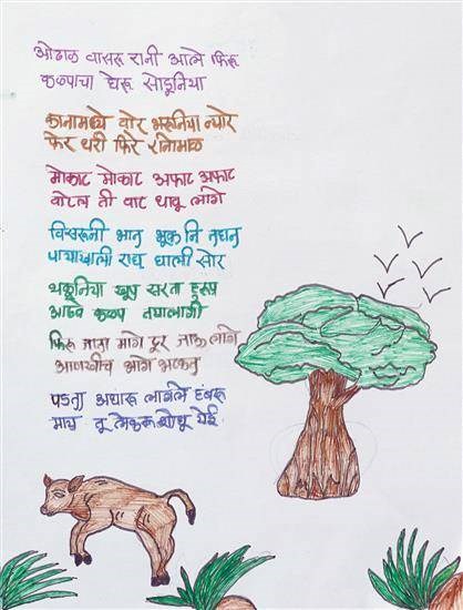 A Calf Shortlisted from Art contest no. 4 for all Ashramshalas Keywords: a calf , cow's baby , happy animal , grass , birds in sky , rocks View Portfolio icon Share Facebook Twitter Whats App Pinterest Description -- Art Number 27161 Artwork Title A Calf Artist Name Renuka Jumbade Medium Sketch Pen on Paper Size 11.81 x 8.26 inches (29.9974 x 20.9804 cm) Information Renuka Jumbade (class 5), Pimpaldari Ashramshala, Kalamnuri PO - Shortlisted from Art contest no. 4 for all Ashramshalas of Tribal Development Department, Govt. of Maharashtra