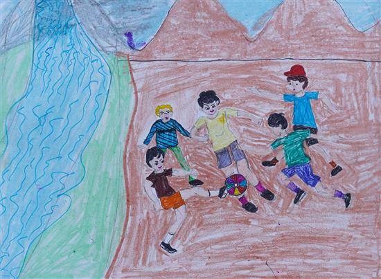 The picnic's joy Shortlisted from Art contest no. 4 for all Ashramshalas Keywords: The picnic's joy , waterflow , mountain , Football player , friend playing football , red cap. boy kicking ball View Portfolio icon Share Facebook Twitter Whats App Pinterest Description -- Art Number 27202 Artwork Title The picnic's joy Artist Name Naitik Madavi Medium Oil Pastel on Paper Size 10.62 x 14.96 inches (26.9748 x 37.9984 cm) Information Naitik Madavi (class 5), Kinhi (Jawade) Ashramshala, Pandharkawada PO - Shortlisted from Art contest no. 4 for all Ashramshalas of Tribal Development Department, Govt. of Maharashtra
