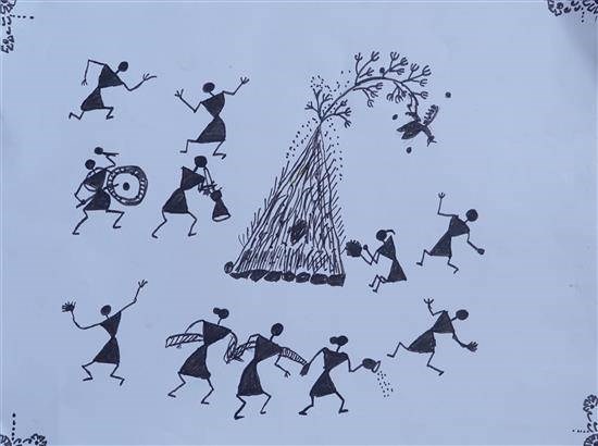 Holika Dahan in tribes Shortlisted from Art contest no. 4 for all Ashramshalas Keywords: Holika Dahan in tribes , bonfire , dancers , drum player , worshipping , cow dung , a tree branch , water pot View Portfolio icon Share Facebook Twitter Whats App Pinterest Description -- Art Number 27207 Artwork Title Holika Dahan in tribes Artist Name Sarika Atram Medium Sketch Pen on Paper Size 10.62 x 11.81 inches (26.9748 x 29.9974 cm) Information Sarika Atram (class 7), Antargaon Ashramshala, Pandharkawada PO - Shortlisted from Art contest no. 4 for all Ashramshalas of Tribal Development Department, Govt. of Maharashtr
