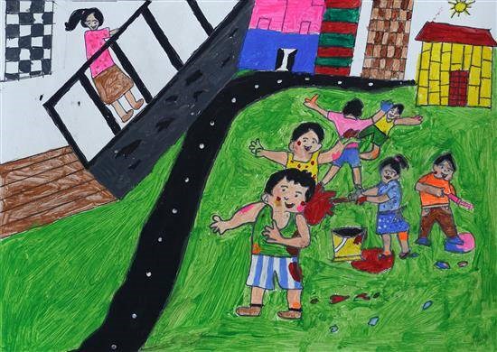 Festival of fun Shortlisted from Art contest no. 3 for all Ashramshalas Keywords: festival of fun , happy children , roof tile home , girl holding color gun , spraying color water , spilled wter , greenery , ground , Sun , girl standing in balcony View Portfolio icon Share Facebook Twitter Whats App Pinterest Description -- Art Number 27231 Artwork Title Festival of fun Artist Name Apurva Kumbhare Medium Watercolour on Paper Size 10.82 x 13.77 inches (27.4828 x 34.9758 cm) Information Apurva Kumbhare (class 8), Jambhulghat Ashramshala, Chimur PO - Shortlisted from Art contest no. 3 for all Ashramshalas of Tribal Development Department, Govt. of Maharashtra