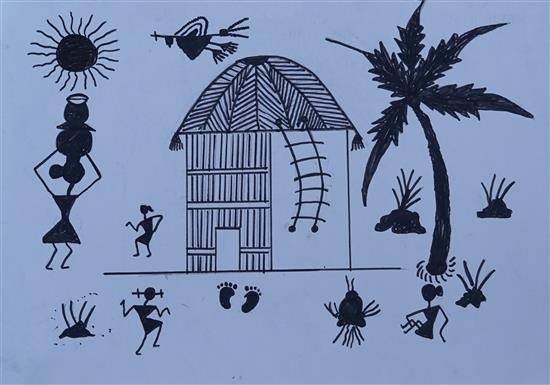Painting in tribal style Shortlisted from Art contest no. 4 for all Ashramshalas Keywords: Painting in tribal style , coconut tree , rocks , grass , Sun , water carrier , bird in sky , foot prints , cooking View Portfolio icon Share Facebook Twitter Whats App Pinterest Description -- Art Number 27331 Artwork Title Painting in tribal style Artist Name Ravina Gedam Medium Sketch Pen on Paper Information Ravina Gedam (class 11), Kasansur Ashramshala, Bhamragad PO - Shortlisted from Art contest no. 4 for all Ashramshalas of Tribal Development Department, Govt. of Maharashtra