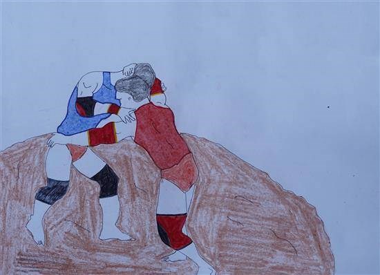 The wrestling Shortlisted from Art contest no. 4 for all Ashramshalas Keywords: the wrestling , two wrestlers , different grappling techniques , clinch fighting , throws and takedowns , joint locks , pins , a wrestling singlet , ground View Portfolio icon Share Facebook Twitter Whats App Pinterest Description -- Art Number 27583 Artwork Title The wrestling Artist Name Rajendra Bethekar Medium Oil pastel and pen on Paper Size 10.82 x 14.76 inches (27.4828 x 37.4904 cm) Information Rajendra Bethekar (class 10), Amravati Ashramshala, Dharani PO - Shortlisted from Art contest no. 4 for all Ashramshalas of Tribal Development Department, Govt. of Maharashtra