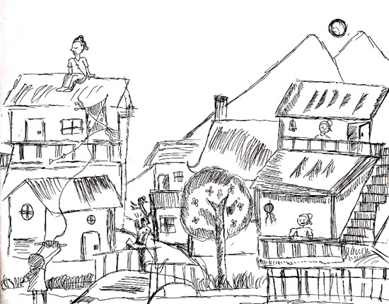 Information It is a bright day where all the people are playing with joyful laughter all around. All the houses in this town are tall as skyscrapers. Behind the town lie the great peaks which glitter in the sun. I used a black sketch pen to draw this picture