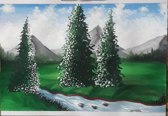 Mountain Melodies, painting by Child Artist Nishtha Sharma View Portfolio icon Share Facebook Twitter Whats App Pinterest Description -- Art Number 28033 Artwork Title Mountain Melodies Artist Name Nishtha Sharma Medium Watercolour on Sheet Information Dipped in the hues of a watercolor dream, my latest creation, 'Mountain Melodies,' captures the essence of life's joys. Three vibrant trees dance in the foreground, their leaves whispering tales of happiness. Majestic mountains stand tall, echoing the grandeur of existence. A playful river weaves through the scene, adding a touch of fluid serenity. Each stroke was a love letter to the beauty that surrounds us, the joyous rhythm of life. With every brushstroke, I found solace in the harmony of nature. 'Mountain Melodies' is not just a painting; it's a celebration of the love poured into each moment of its creation.