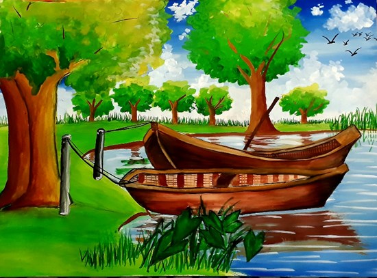 Information This painting is my personal daydream brought to life on canvas. Imagine this: a serene riverside, where calm waters gently flow, and nature's symphony plays in the background. The scene captures the essence of my longing for a peaceful retreat. The soft hues and soothing tones transport you to a place I've always dreamt of, a place where time slows down, and worries drift away like leaves on the water. It's my painted wish, an invitation to a world of calm by the river's edge, where I yearn to be.