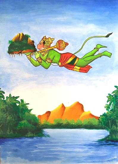 Hanuman carrying Sanjeevi mountain Bronze medal in Khula Aasmaan Ramayana art contest Keywords: Ramayana , ram , hanuman , sanjeevi mountain , mountain , history , god View Portfolio icon Share Facebook Twitter Whats App Pinterest Description -- Art Number 28294 Artwork Title Hanuman carrying Sanjeevi mountain Artist Name Akshaya Navaladi Medium Acrylic on Paper Size 16.53 x 11.69 inches (41.9862 x 29.6926 cm) Price Rs. 6,000 ($81.41) Information Helping character of Hanuman This painting by child artist Akshaya Navaladi (14 years) received Bronze medal in Khula Aasmaan Ramayana art contest. See the short video about this artwork