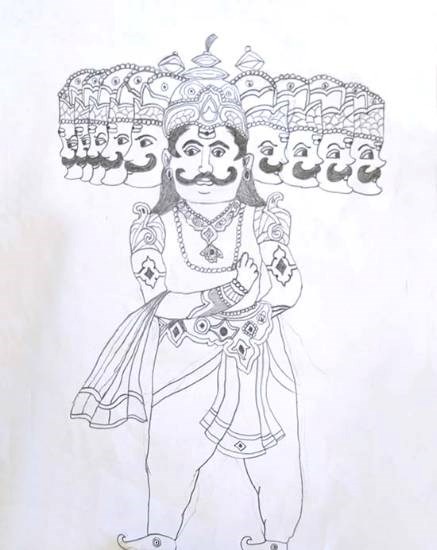 Ravan artwork by Anandraj Singh Keywords: Ravan , Ramayana , attitude View Portfolio icon Share Facebook Twitter Whats App Pinterest Description -- Art Number 28330 Artwork Title Ravan Artist Name Singh Anandraj Medium Pencil on Paper Size 11.69 x 8.27 inches (29.6926 x 21.0058 cm) Price Rs. 4,000 ($54.27) Information It is a drawing of Ravan full of attitude. This painting by child artist Anandraj Singh (12 years), Shortlisted in Khula Aasmaan Ramayana art contest.