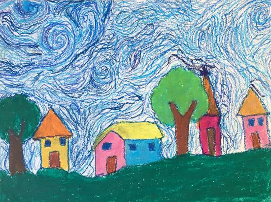 View Details An evening view from a beach Oil pastel and graphite pencil on Paper 8 x 12 inches 20.32 x 30.48 cm