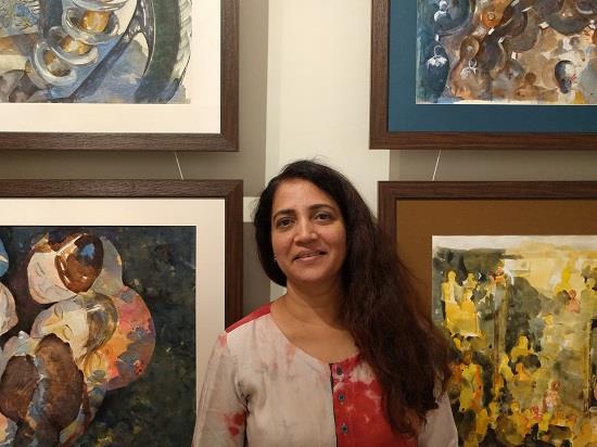 Janaki Anand with her paintings at Indiaart Gallery, Pune