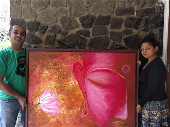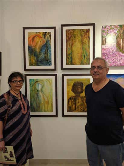 • Nupur Sinha and Shubhankar Tiwari with her paintings at Indiaart Gallery, Pune