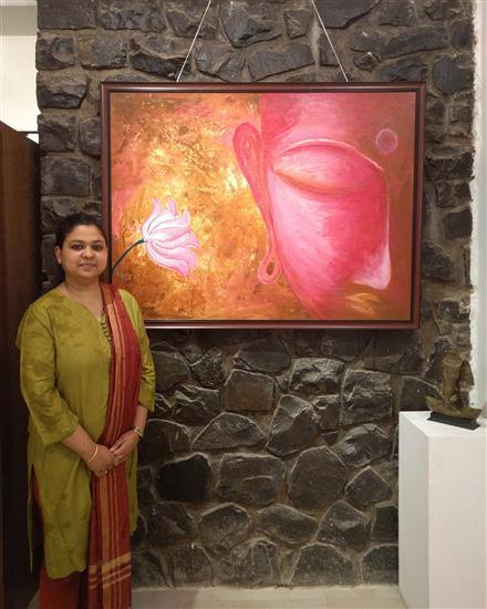 Deepali Sagade with her painting at the second edition of Emerging Artists Show at Indiaart Gallery, Pune