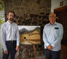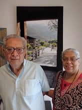 Dr. Stewart Gordon and Shashi Sharma with Milind Sathe's picture of Tabo monastery at Indiaart Gallery, Pune