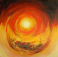 Subject of his works are combination of mythology and today's technology. His works are Acrylic on Canvas. Though he has used vibrant colours but he has succeeded in engaging viewer in the subject of the painting rather than concentrating on colour.