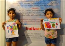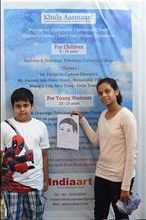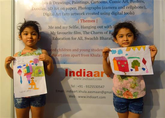 Twin girls at Khula Aasman stall with their paintings, at Bharatiya Vigyan Sammelan 2017