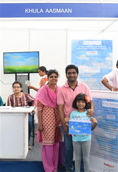 Young girl with the artwork she created at Khula Aasmaan stall along with her parents