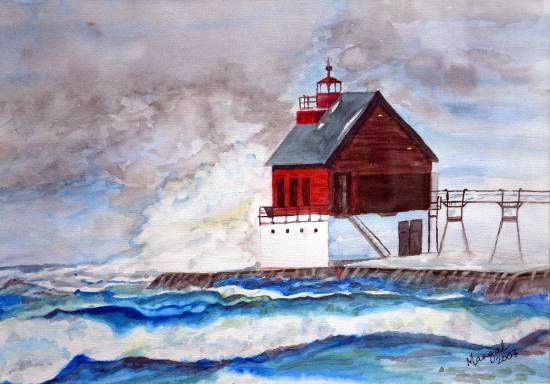 Stormy sea and a lighthouse, Dapoli, Painting by Artist Mangal Gogte