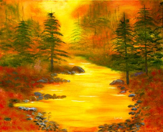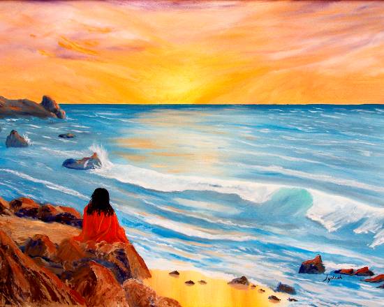 Nayaswami Jyotish’s preferred medium for painting is oil colours. His paintings use imagery which has spiritual meaning. The mountains, the abode of ancient yogis, suggest aspiration and seclusion in his paintings. The ocean is a symbol of infinity, while waves denote that the ego is pulling away from infinity and merging back into it. He uses vivid colours, to bridge the gap between the material world and the astral or heavenly world of heightened senses.