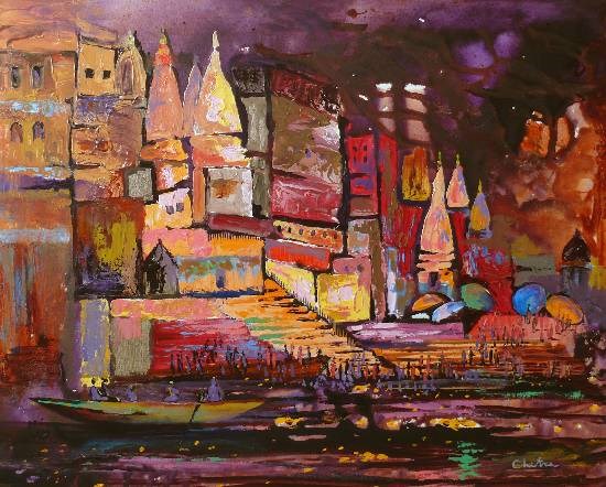 painting of banaras ghats in acrylic on canvas