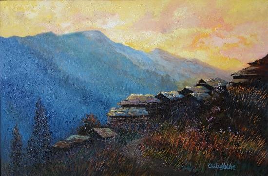 The original oil on canvas painting shows the beautiful twilight at Shoja, a small village in Himachal Pradesh, India.
