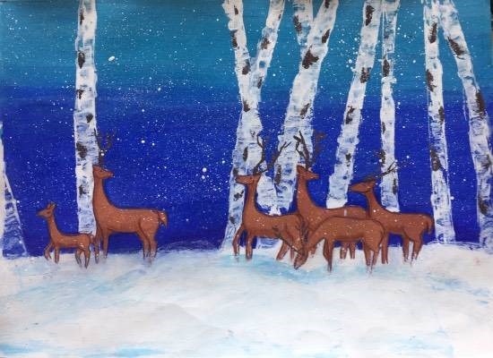 Deer in snow, painting by Child Artist Pratyush Kuldeepsinh Jagtap