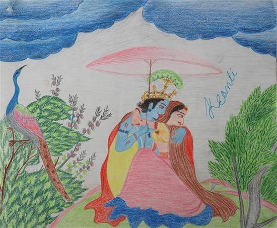Radha Krishna, painting by Child Artist Kranti Waghmare Honorable Mention in Khula Aasmaan national kids painting competition Keywords: Radha , Krishna , Radha-Krishna , Bird , plants , Sky. View Portfolio icon Share Facebook Twitter Whats App Pinterest Description -- Art Number 22245 Artwork Title Radha Krishna Artist Name Kranti Waghmare Medium Colour Pencil on Paper Size 10.5 x 12 inches (26.67 x 30.48 cm) Information This painting by child artist Kranti Waghmare received a Honorable Mention in Khula Aasmaan kids art competition for January to March 2019.