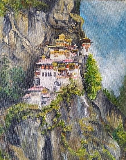 The Sacred country - Bhutan Painting by Shradhha Virkar Keywords: The Sacred country , Bhutan , monastery , tiger nest , Himalaya , mountains View Portfolio icon Share Facebook Twitter Whats App Pinterest Description -- Art Number 22878 Artwork Title The Sacred country - Bhutan Artist Name Shraddha Virkar Medium Oil Paint on Canvas Information This is the memory of my visit to the monastery in Bhutan. The beautiful Tigers Nest monastery is situated on top of the Himalayan mountain.