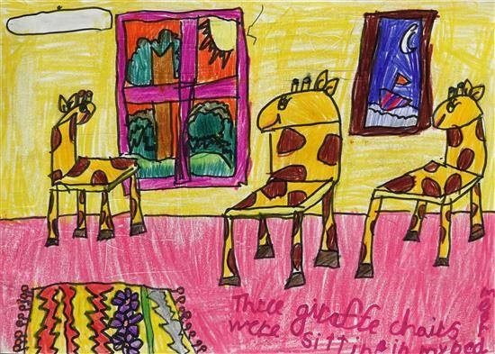 Giraffe Chairs Gold medal in Khula Aasmaan art competition for children Keywords: giraffe , chairs , giraffe chair , conceptual , room , living room , architecture , still life , animal View Portfolio icon Share Facebook Twitter Whats App Pinterest Description -- Art Number 23342 Artwork Title Giraffe Chairs Artist Name Aanya Sehgal Medium Oil Pastel on Paper Size 8.27 x 11.69 inches (21.0058 x 29.6926 cm) Price Rs. 5,900 ($80.05) Information This painting by child artist Aanya Sehgal received a Gold Medal in Khula Aasmaan art competition for children for October to December 2019.