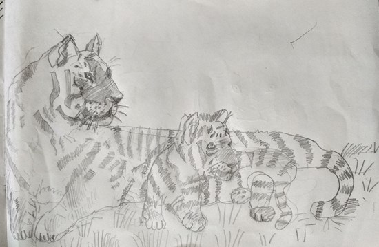 Tigers, painting by Child Artist Neel Kirtane View Portfolio icon Share Facebook Twitter Whats App Pinterest Description -- Art Number 23572 Artwork Title Tigers Artist Name Neel Kirtane Medium Pencil on Paper Information Pencil sketch of Tiger and its cub watching over bushes.